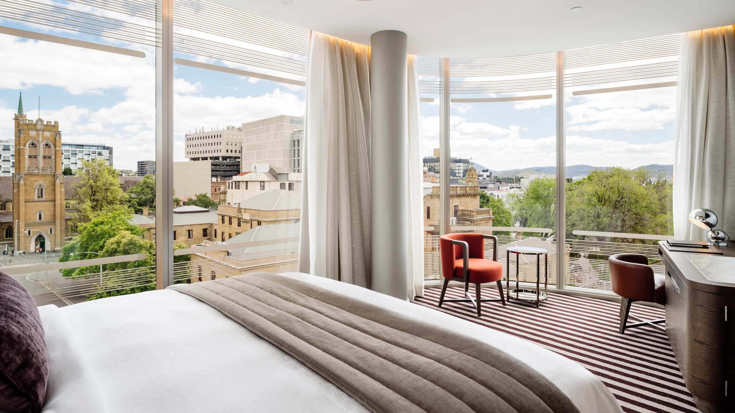 Proyek The Tasman dimulai sejak 2015, tapi baru rampung setelah menghadapi tantangan warisan budaya dan penundaan pandemi. Bangunan asli adalah bekas kantor pemerintah negara bagian, termasuk rumah sakit era 1847 yang kini menjadi Heritage Building. Arsitek lokal bekerja sama dengan Marriott untuk memadukan elemen-elemen ini tanpa merusak keaslian, menghasilkan “simfoni arsitektur” yang memukau. Gedung Art Deco menawarkan nuansa 1940-an yang elegan, sementara Pavilion Building modern memberikan pemandangan spektakuler ke pelabuhan Derwent.